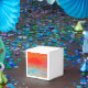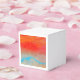 An abstract design of an ocean sunset with bold colors in red, orange, cyan, blue, and beige.
