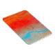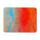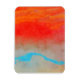 An abstract design of an ocean sunset with bold colors in red, orange, cyan, blue, and beige.
