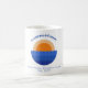 Beautiful elegant mug with minimalistic scene of ocean and setting sun. Personalize it with a name or text. This simple illustration captures the serene beauty of a sun setting at the ocean. The waves are simple curved lines, starting from the bottom of the illustration and extending upwards towards the horizon line. Different shades of rich blue add to the sea dynamics. The sun is a large circle glowing in a brilliant orange, dipping into ocean. The sun and the ocean waves evoke vintage vibes and create tranquil scene and elegant design.