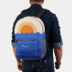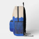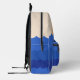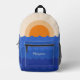 Beautiful elegant backpack with minimalistic scene of ocean and setting sun. Personalize it with a name or text. This simple illustration captures the serene beauty of a sun setting at the ocean. The waves are simple curved lines, starting from the bottom of the illustration and extending upwards towards the horizon line. Different shades of rich blue add to the sea dynamics. The sun is a large circle glowing in a brilliant orange, dipping into ocean. The sun and the ocean waves evoke vintage vibes and create tranquil scene and elegant design.