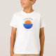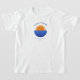 Beautiful elegant t-shirt with minimalistic scene of ocean and setting sun. Personalize it with a name or text. This simple illustration captures the serene beauty of a sun setting at the ocean. The waves are simple curved lines, starting from the bottom of the illustration and extending upwards towards the horizon line. Different shades of rich blue add to the sea dynamics. The sun is a large circle glowing in a brilliant orange, dipping into ocean. The sun and the ocean waves evoke vintage vibes and create tranquil scene and elegant design.