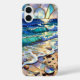 Beautiful and luminous, this phone case features a serene beach scene with rolling ocean waves, scattered seashells, and glowing light in a stained-glass–inspired style.