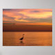 A beautiful sunset over the shores of the Gulf of Mexico with shades of red, gold, and orange make a splendid and colorful image. A great blue heron bird stands in the water in the foreground while two sea gulls are seen in the sky. The digital painting is based on photographs taken at Fort Myers Beach, Florida, by Roger Knowles.