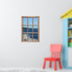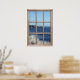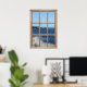 Poster that looks like a window -- sea foam If you could look out your window and see the blue ocean waters, the scene might look just like this one. This fake window picture with its wooden frame looks out onto waves crashing in a spray of sea foam. In the distance are the white buildings of a coastal village and the green hills. All you have to do is imagine the sound of the rolling waves and the cry of sea birds to believe you are right there beside the sea.