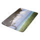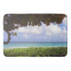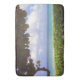 The original photograph by ZoeSPEAK on this large Bath Mat is a view of the Atlantic ocean, framed by a thick growth of sea grapes on the dunes above Juno beach. There are more sea grapes overhead, with their disk-like yellow green leaves. The sky is blue with puffy white clouds over a marine and aqua blue sea.