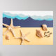 Top view of starfish and sea shells with paper ocean waves