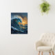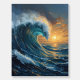 The artwork captures a dynamic ocean wave illuminated by warm sunset tones, blending deep blues with golden highlights to create a bold yet calming visual impact.