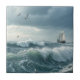 Ocean waves with seagulls flying overhead and a ship in the distance