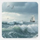 Ocean waves with seagulls flying overhead and a ship in the distance