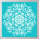 This white mandala sits on a turquoise background. The colors are very calming and peaceful. Part of the Pras Mandala Collection.