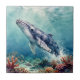 A oceanic themed tile with a beautiful illustration of an impasto style whale swimming deep in the sea by vibrant colorful coral. A really beautiful coastal art. Colors used are teal, blue and soft coastal colors. beautiful for a beach home backsplash.