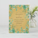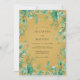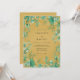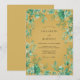 This artistic design features a rich ochre background adorned with teal and sage green botanical greenery. Delicate vines and leafy sprigs of eucalyptus create a vibrant border around the central area. The color palette of deep yellow and cool greens evokes a sophisticated autumnal atmosphere.