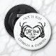 Raise a toast to forever with this unforgettable “Till Death Do Us Part” bottle opener. Featuring two skeleton hands forming a heart around elegant gothic script, this bold black-and-white design is personalized with your names and wedding date.