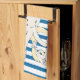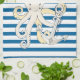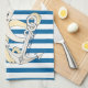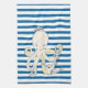 Bright blue and white horizontal pattern design kitchen towel features a nautical ocean theme with an octopus wearing a sailor's hat and a silver anchor!