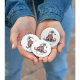 The front of the pin button offers a prominent area for customizable text. Personalize this cheerful accessory with: