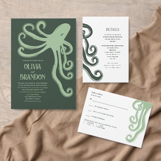 A symbol of adaptability, selflessness, and longevity, the octopus is the perfect hallmark for your wedding invitations. This modern design will be remembered for years after the wedding. You may edit all text to suit your event.