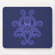 An intricate octopus design decorated with blue swirls and dots. The symmetrical design has all eight legs outstretched and it’s eyes looking forward.