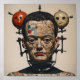 Mechanical doll with drawings, photocollages and two spherical heads. Design on square poster.