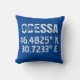 Modern throw pillow design features latitude and longitude coordinates for Odessa, Ukraine in distressed light gray font on blue background