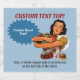 Woman wearing a ruffled apron holding glass jars of vegetables. Custom background color. Top and bottom custom text. Customizable and removable burst bubble with custom text.
