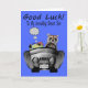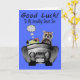 Wish your incredibly smart son who's going off to college good luck with an adorable smiling raccoon driving a shiny sports car packed full of luggage, books and a sleeping bag. Background is a pretty blue.