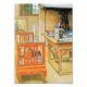 Carl Larsson's Office with his little girl peeking through the rungs of an orange bench. Background includes table with the artists brushes and supplies. It's a scene from the artist's home.