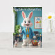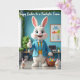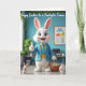 This card shows a friendly, humanlike white bunny centered on the front, with long upright ears, rosy cheeks, and a wide smile that feels like it’s meant for a close friend 🐰. One paw is raised in a thumbs-up, while the other holds a woven basket filled with glossy eggs in pink, green, yellow, and blue. The bunny wears a neat blue blazer over a bright yellow vest with a matching blue tie, giving it a put-together look with a gentle, affectionate warmth. Behind it, a softly blurred office setting suggests desks and computer screens, and a framed chart on the wall reads “GOAL ACHIEVED!” in clear, dark lettering. Across the top edge, a draped green garland adds a spring touch 🌷 against the cool blue wall. Near the bottom, two smaller bunnies with orange bow ties face inward as if sharing a quiet, supportive moment together. A short message sits near the top in white lettering, centered above the main character. The overall scene includes the leafy garland along the upper border and the two small bow-tied bunnies anchored at the lower corners.