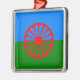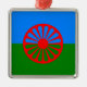 Official Romany gypsy traveler flag of green and blue representing the earth and sky with a red wagon wheel, representing travel.