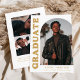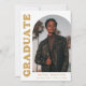 Stylish and trendy graduation announcement featuring the graduate's photo on the front with an offset arch photo frame. "Graduate" is displayed in bold gold retro lettering on a white background. Personalize the front of the arch photo graduation announcement by adding the graduate's name, school, and graduation year. The card reverses to display an additional 3 photos with space for custom text such as future college plans, career plans, graduation party details, etc. The gold graduation announcement is perfect for both high school and college graduates.