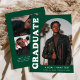 Stylish and trendy graduation announcement featuring the graduate's photo on the front with an offset arch photo frame. "Graduate" is displayed in bold white retro lettering on a green background. Personalize the front of the arch photo graduation announcement by adding the graduate's name, school, and graduation year. The card reverses to display an additional 3 photos with space for custom text such as future college plans, career plans, graduation party details, etc. The green graduation announcement is perfect for both high school and college graduates.