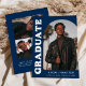 Stylish and trendy graduation announcement featuring the graduate's photo on the front with an offset arch photo frame. "Graduate" is displayed in bold white retro lettering on a navy blue background. Personalize the front of the arch photo graduation announcement by adding the graduate's name, school, and graduation year. The card reverses to display an additional 3 photos with space for custom text such as future college plans, career plans, graduation party details, etc. The navy blue graduation announcement is perfect for both high school and college graduates.