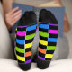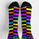 These unisex geometric socks feature offset blocks of black with bright colors of yellow, orange, green, blue, hot pink and purple.