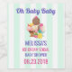 A personalized wine bottle label for baby shower prizes/favors. Perfect for an ice cream social themed party. Text at the top says: Oh baby Baby with your personalized event details. Illustrated with a bowl of ice cream with 3 delicious scoops covered in candy sprinkles. An ice cream cone also with 3 scoops of chocolate, vanilla and strawberry. A dessert bowl filled with neopolitan flavored ice cream with a delicious cherry on top. A green and white stripes pattern in the background.