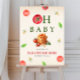 Pizza & Pacifiers baby shower pasta party theme with Illustration of a tomato incorporated in to the design "oh baby" with tomato, basil, pasta and pacifier illustrations all around.