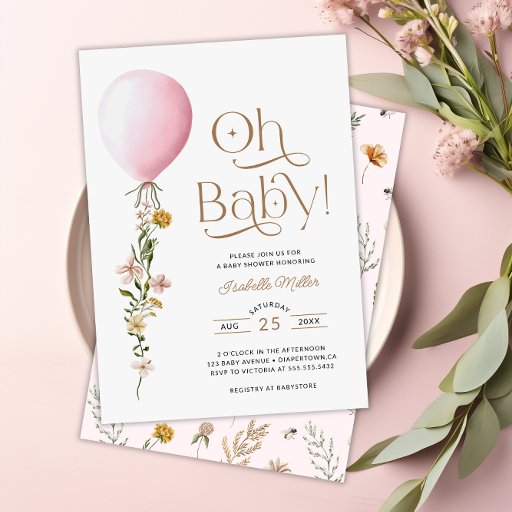 Oh Baby Pink Balloon Floral Baby Shower Invitation