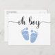 Cute minimal baby boy shower postcard invitation with "oh boy" in a stylish script with swashes and a pastel blue watercolor of baby feet. On the reverse side you can easily personalize the shower details.
