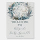 Sweet bunny rabbit playing with a hacky sack "oh boy" blue floral wreath baby sprinkle "Welcome" design on a pale gray background.