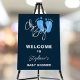 This cute baby boy's baby shower welcome sign features "Oh Boy!" in stylish script typography and blue baby feet on a navy blue background.