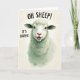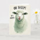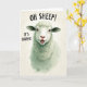 This card features a friendly sheep face centered on the front, drawn with soft realism and a gentle, inviting charm. Its big dark eyes, framed by fine lashes, seem to glance outward with a tender, amused look, like it’s sharing a private joke with a close friend. An open smile shows a rosy pink mouth, adding to the cheerful, slightly surprised expression. Fluffy wool is painted in feathery strokes, staying bright white around the face and shifting into pale green and light gray across the body for depth and softness. The background is warm off-white with a light paper-like texture, and the lighting stays even so the details feel calm and cozy 🌷. Across the design, the phrase “OH SHEEP! IT’S EASTER!” appears in large, dark, hand-drawn lettering, arranged to balance the sheep’s face without covering it 🐰. The words sit prominently near the top area, with the sheep’s rounded cheeks and layered wool filling the center against the softly mottled cream backdrop.
