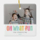This fun holiday ornament features a single photo on the front over the words "oh what fun" written in multicolored letters. It has space for your name and the year, making it the perfect Christmas keepsake or gift.