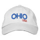 The Ohio is in the state colors of Ohio: red, white, and blue. The hat can be customized: colors, style, sizes, and wording.