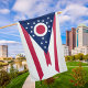 The Ohio state flag has a burgee shape. It consists of three red and two white horizontal stripes representing the main roads and waterways of the state. The union of the flag has a blue triangular field with a white circle in the center. There are seventeen white five-pointed stars arranged around the circle. The base of the staff end or vertical edge of the flag is the center of the middle red stripe and a blue triangle behind it. The thirteen stars surrounding the circle represent the original thirteen states of the United States. The four stars at the end of the triangle symbolize that Ohio was the seventeenth state to join the union. The white circular "O" in the center of the blue circle represents the "O" in "Ohio" and also the Buckeye State, which is the nickname for Ohio. The official government flag angled cut.