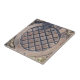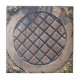 Top view of an old and rusty manhole metal plates closeup, surrounded by soil and dry grass