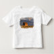 Old barn framed by hay bales and dramatic toddler t-shirt