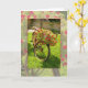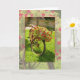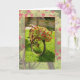 Gorgeous red geranium flowers sitting in the basket on the front of an old rusted bike, on the lawn of a home. Rich reds and greens on a summer day. The design consists of a faded out enlarged image used as the border framing the bright flowers in bicycle photo. Born from my own original photography and design.