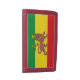 A trifold wallet with a historical flag of Ethiopia; red, golden and green horizontal stripes with Lion of Judah with a crown and spear in the center; used from 1897 to 1974