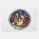 A stained glass window photographic design of the nativity with Mary, Joseph and the infant Jesus.