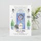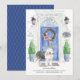 Announce your new address with our stylish announcement featuring an Old English Sheepdog, blue front door, welcome mat, slate sign, topiaries and a floral wreath set on a gray brick background.