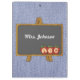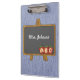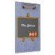 Stylish teacher's clipboard, with graphics of a blue denim background and cute cartoon like graphics of an easel style chalkboard. Personalize the white text, on the chalkboard, to suit your needs.