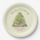 Charming vintage color Christmas tree image illustration. An evergreen tree is decorated with candles and trinkets with presents, toys and fruit underneath. Set on antique off-white. Merry Christmas in green Christmas font and bottom custom message in red font can be personalized with your message.